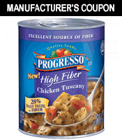 Go here and look for the square Progresso ad on the right sidebar. (If you don’t see it, keep refreshing your page until you do see it. It took me about 12 times of refreshing before I saw it.) Once you find it and click on it, you’ll be able to print a coupon for $1 off 1 can of Progresso High Fiber soup. Use your browser’s back button to print the coupon twice per computer.