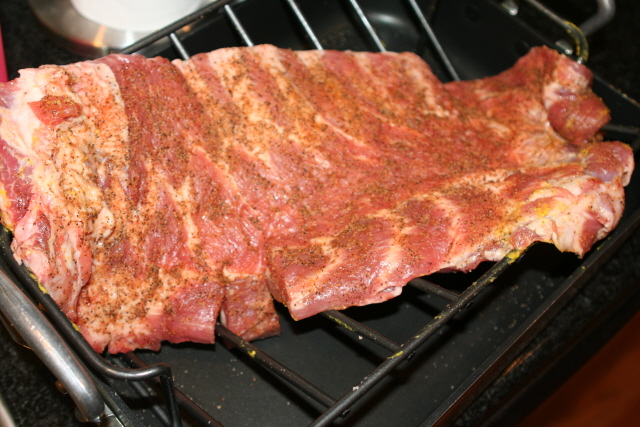 2.  Rub mustard into ribs first, then sprinkle rub over it and rub it in.  Let this sit about 1-2 hours.