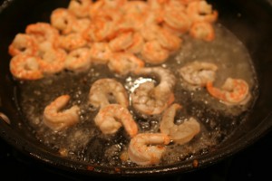 3. Saute shrimp in bacon drippings, remove from pan and put on plate (don’t put on paper towel). When they are “c” shaped they are done.