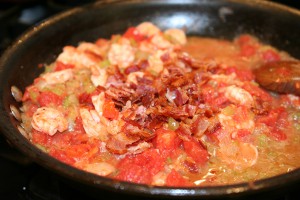 - Saute shrimp in bacon drippings, remove from pan and put on plate (don’t put on paper towel). When they are “c” shaped they are done.