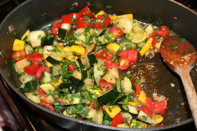 2. While pasta is cooking, brown garlic, and start sauteing the shallots, zucchini, and squash.
