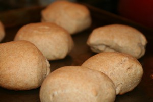 - Deflate the dough, and turn out onto a lightly floured surface. divide the dough into 16 equal pieces, and form into round balls. Place on lightly greased baking sheets at least 2 inches apart. Cover the rolls with a damp cloth, and let rise until doubled in volume, about 40 minutes. Meanwhile, preheat oven to 400 degrees.
