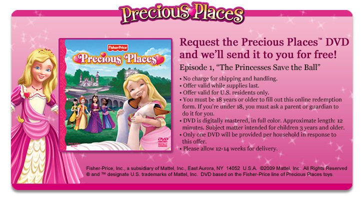 :: Go here to order your FREE Precious Places Princess DVD. Delivery is 12-14 weeks, but just in time for my daughter’s birthday, or our summer break!
