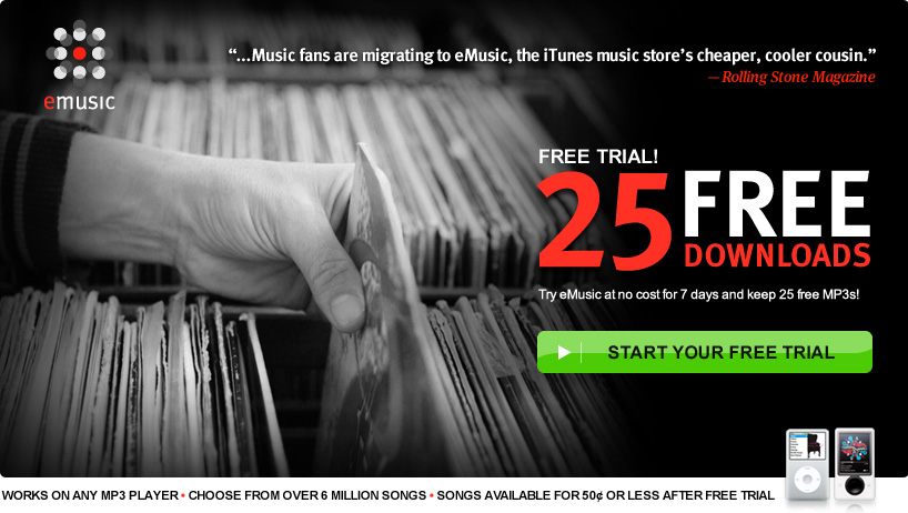 Sign up for for a free trial to eMusic and get 25 free songs! If you don’t want to continue the free trial, you can cancel once your 7 day membership is up. But if you decide to keep your membership, then you should know that most music is less than $.50 per song, which is a much better deal than iTunes.