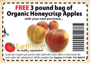 Get a FREE 3-lb. bag of Organic Honeycrisp Apples at the Earth Fare Supermarket with any purchase through 11/1/09! (Thanks, Money Saving Mom!)