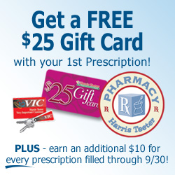 Get a FREE $25 Gift Card with your First Presription PLUS Save $10 off your next Harris Teeter purchase, for EVERY prescription filled through September 30, 2008!