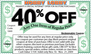 Go here to print a 40% off printable coupon for any regular priced item at Hobby Lobby.