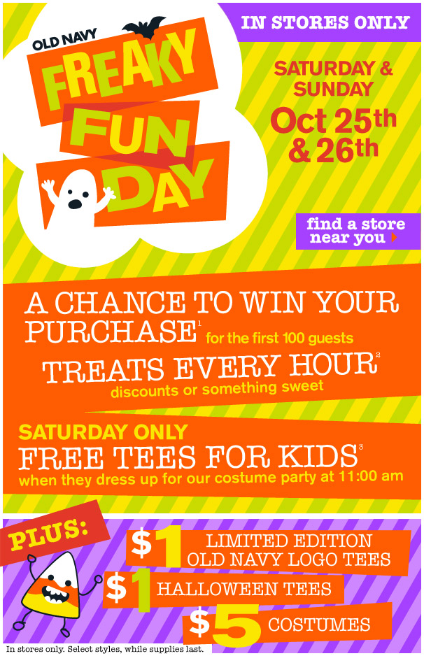 This Saturday and Sunday (Oct 35th & 26th) Old Navy is hosting a Freaky Fun Day . Looks like fun and a GREAT deal to get: