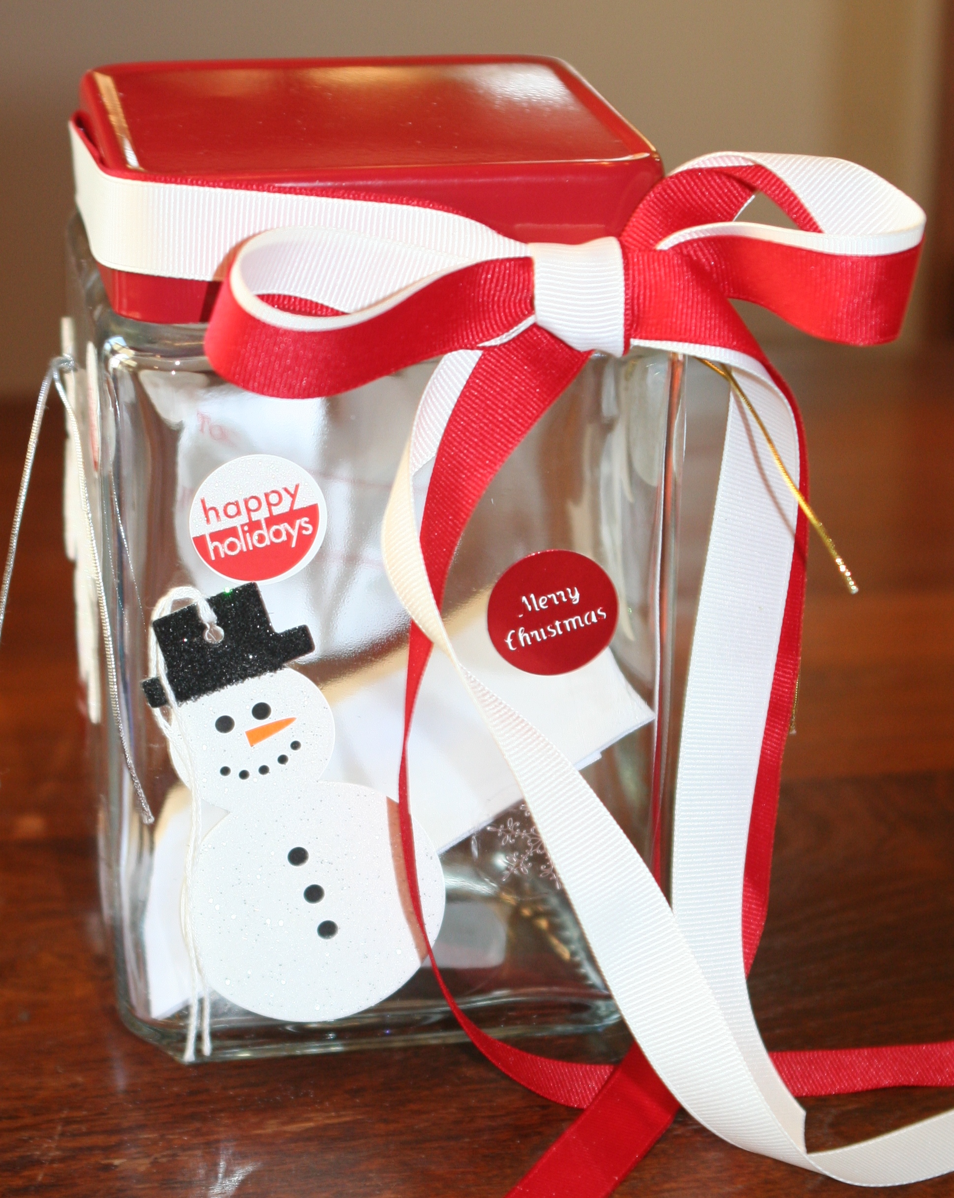Last week while at the fun craft night with Amy from Mom Advice and Glade, they showed us this great idea on how to do a Christmas Jar. I love this idea! All you do is decorate a jar and put 24 slips of paper inside, each with an activity to do every day of December. Each day you let your children pull out a piece of paper and you do the activity listed on it. Here is a picture of the one I created to give you some ideas, but it can look however you want. You could even take an old oatmeal container, or coffee tin and let the kids decorate construction paper to wrap around it! Next are some of my ideas of things we will be writing on our slips of paper, and a link to Amy’s ideas at the bottom.
